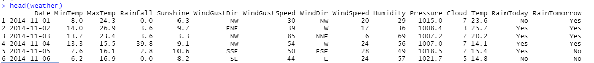 $ RainToday : chr "No" "Yes" "Yes" "Yes" ...