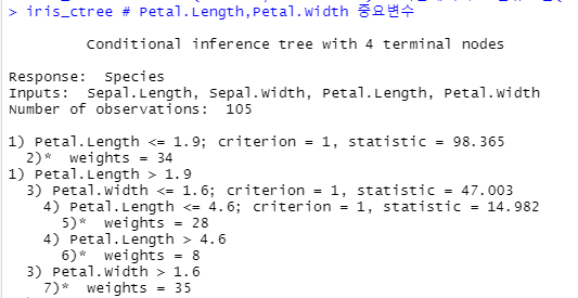 iris_ctree # Petal.Length,Petal.Width 중요변수