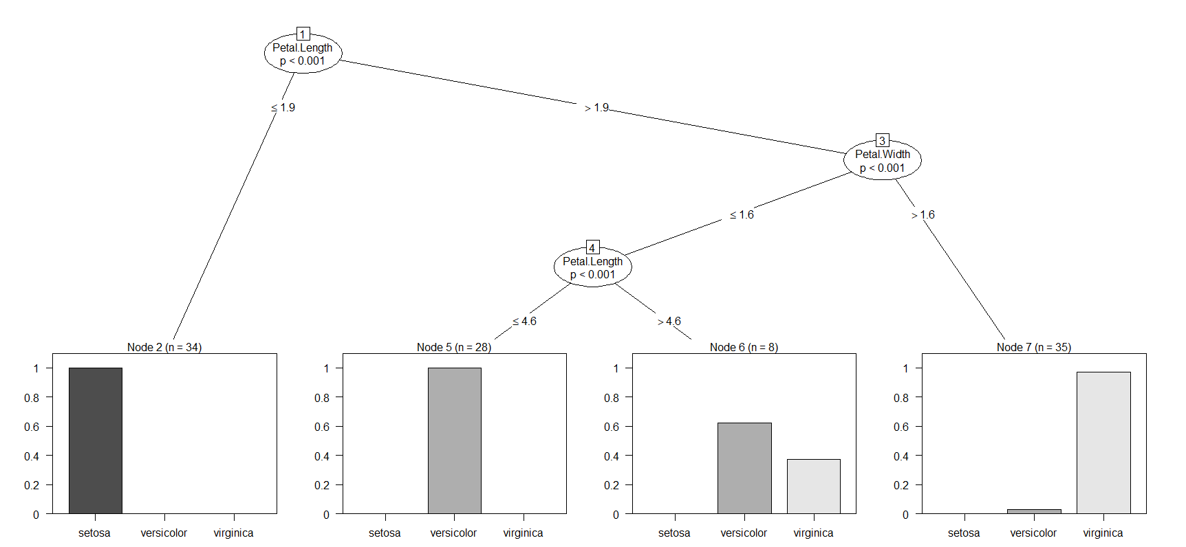 Node 6, Petal.Length 1.9 이상, Petal.Width 1.6이하, Petal.Length 4.6 이상 = versicolor or virginica (불명확)
