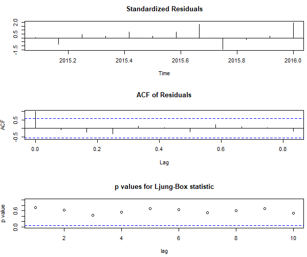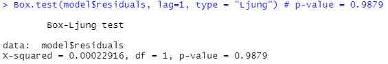 Box.test(model$residuals, lag = 1, type = "Ljung")