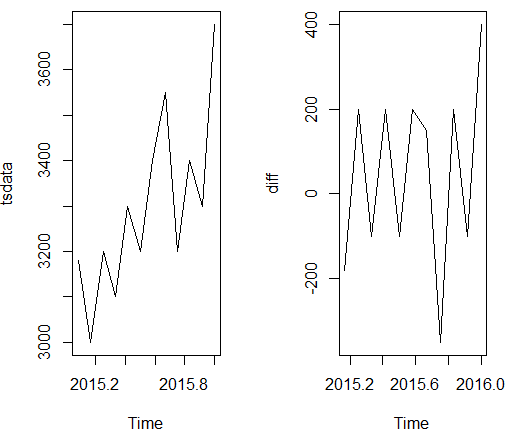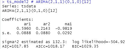 model <- arima(tsdata, c(2,1,1), seasonal = list(order = c(0,1,0)))