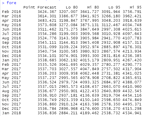 - forecast 패키지에서 제공하는 forecast() 함수는 시계열의 예측치를 제공하는 함수로 기본 기간은 2년(24개월)