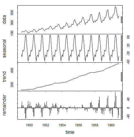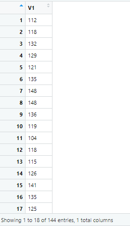 출력값 : Time-Series [1:144] from 1949 to 1961: 112 118 132 129 121 135 148 148 136 119 ...
