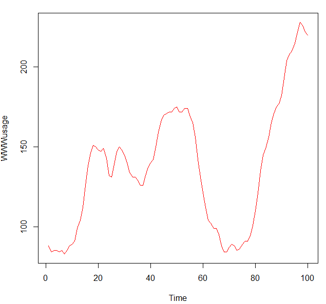 ① WWWusage 데이터 셋 가져오기 - R에서 기본 제공 데이터 셋으로 인터넷 사용 시간을 분 단위로 측정한 100개 vector로 구성된 시계열 자료