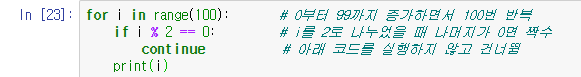 for를 사용하여 0부터 99까지 반복합니다. 그리고 if를 사용하여 i가 짝수이면 continue를 실행합니다( i를 2로 나누었을 때 나머지가 0이면 짝수, 0이 아니면 홀수입니다). 마지막으로 print를 사용하여 i의 값을 출력합니다.