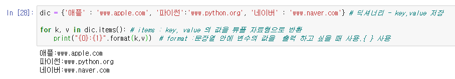 - format 사용 : 문장열 안에 변수의 값을 출력 하고 싶을 때 사용 - { } 사용