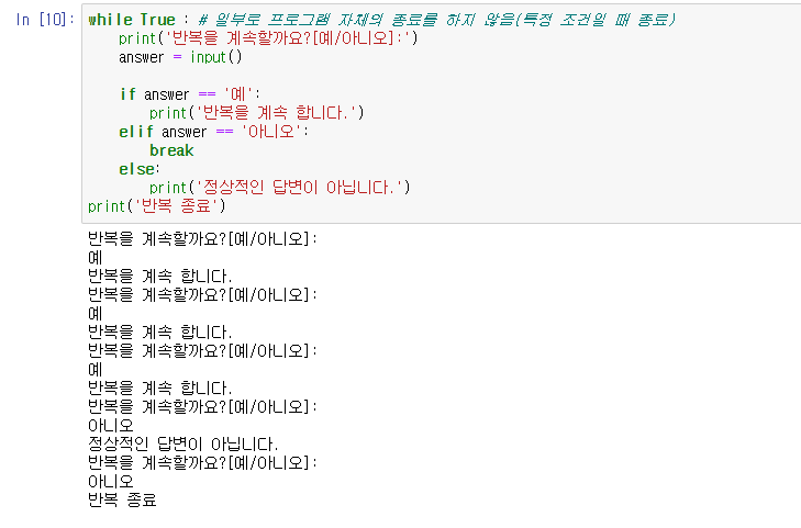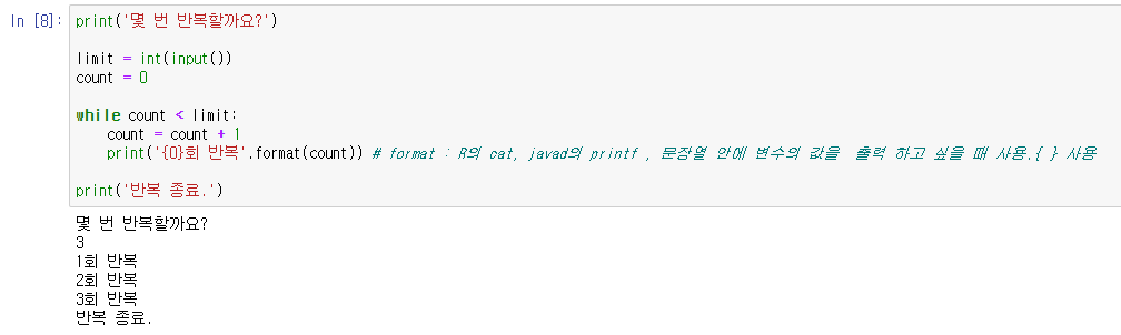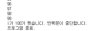 : while 반복문은 조건식으로만 동작하며 반복할 코드 안에 조건식에 영향을 주는 변화식이 들어갑니다.
