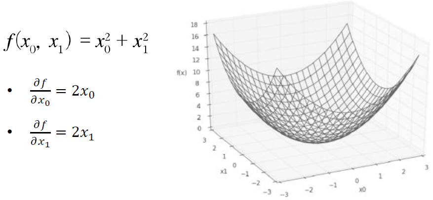 : 변수가 여러 개인 함수에 대한 미분을 편미분이라고 합니다. 편미분 역시 변수가 하나인 미분과 동일하게 특정 장소에 대한 기울기를 구합니다. 목표 변수 하나에 초점을 맞추고 다른 변수는 값을 고정합니다.