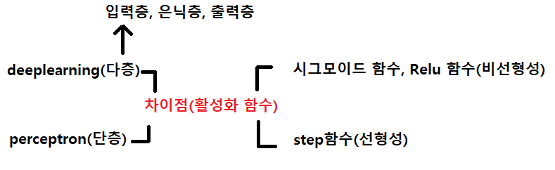 : 퍼셉트론에서 출발하여 여러 입력신호를 입력받아서 출력을 내보내주는 표현이 퍼셉트론이었는데, 퍼셉트론과의 차이는 활성화 함수를 어떤 것을 사용하느냐에 차이를 가집니다. 퍼셉트론은 스텝 함수를 사용하고, 신경망은 시그모이드 함수를 사용합니다. 스텝 함수는 선형성이고, 시그모이드 비선형입니다. 게이트를 통해서 결과를 확인할 때, XOR는 비선형의 형태를 통해서 코드상으로 구현할 수 있습니다. 코드의 형태를 봤을 때, 입력과 출력의 형태로만 되어있던 것을 은닉층을 통해 다층의 구조를 가져갈 때, 활성화 함수를 시그모이드 함수로 활용하여 선형적으로 절대 분류 할 수 없었던 특징을 비선형으로 구현할 수 있게 되었습니다.