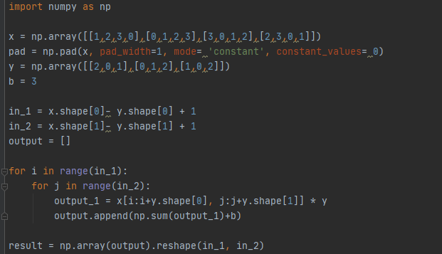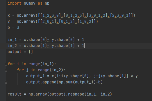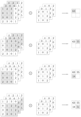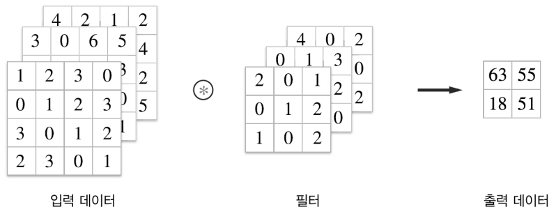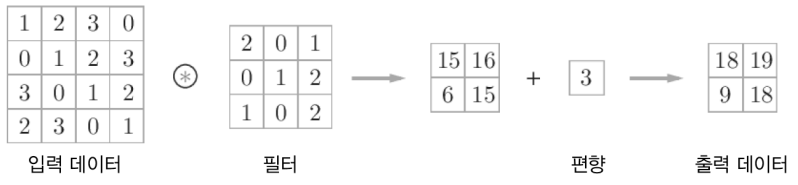 - 위 예의 경우 입력은 (4, 4), 필터는 (3, 3), 출력은 (2, 2)