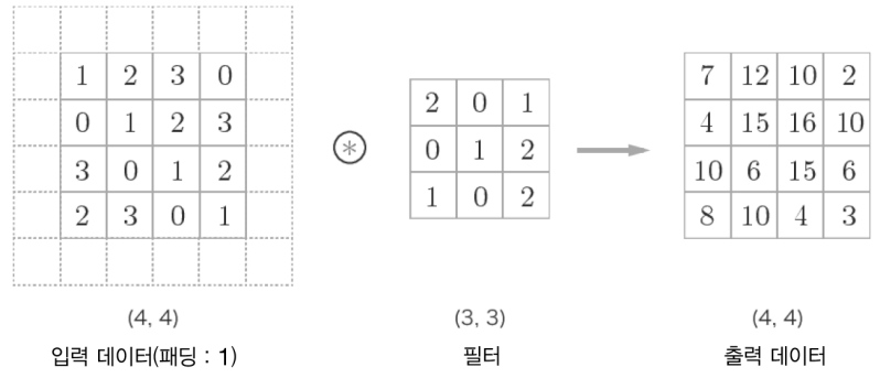 - 합성곱 연산에서 자주 이용하는 기법 – 출력 크기를 조정할 목적으로 사용합니다.