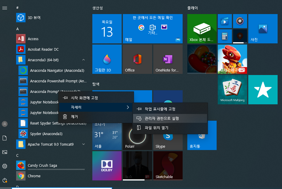 anaconda prompt를 관리자 권한으로 실행합니다.