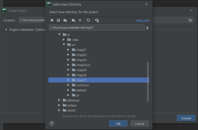 저장했던 가상환경을 설정하여 ok를 눌러주고, creat를 눌러줍니다.