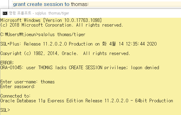 -- 다른 계정에게 create session 을 할 수 있는 권한이 생겼다.