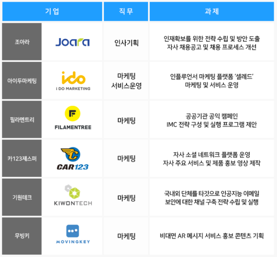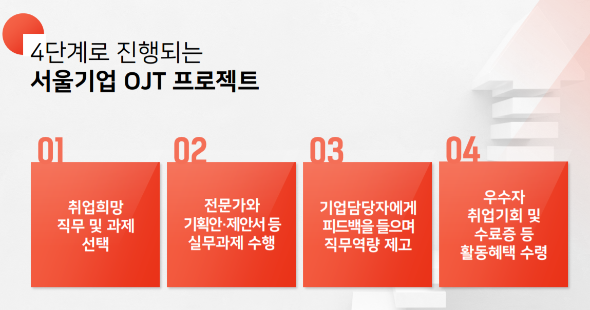 기업에서도 실무 경험을 한 인재를 원하고, 인재들 또한 업무를 경험하고 싶은 현 상황에서 서로 win - win 하기 위한 방법으로 ojt의 형태로 실행된다는 취지로 프로그램을 진행한다고 합니다.