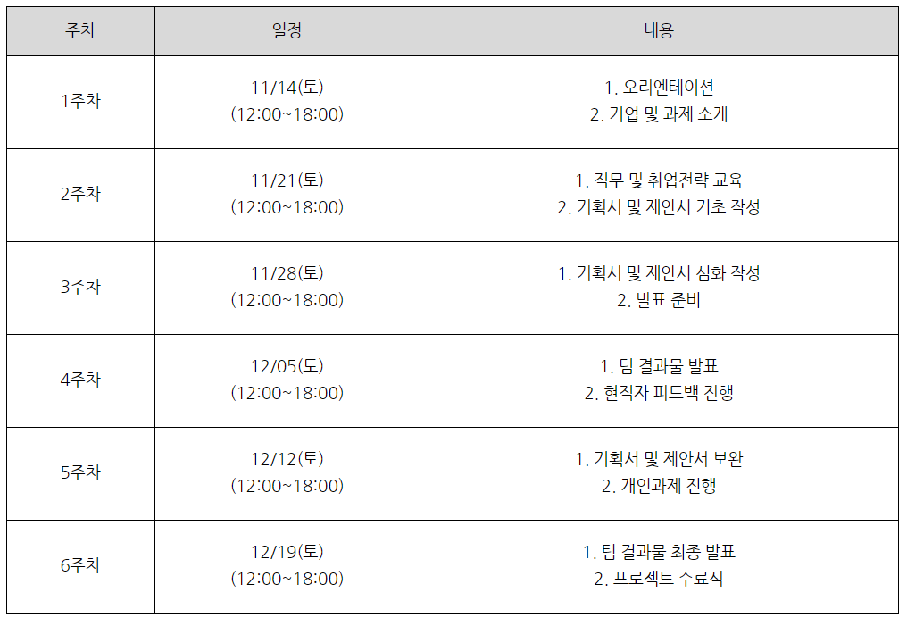 연결된 기업의 과제에 대해서 설명을 듣고 6주동안 결과물을 만들어갑니다.