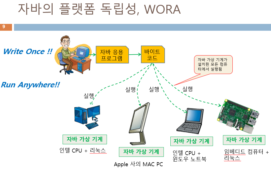 새로운 기계라도 자바 인터프리터만 설치되어 있으면 바이트 코드를 해석할 수 있습니다.