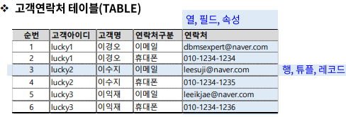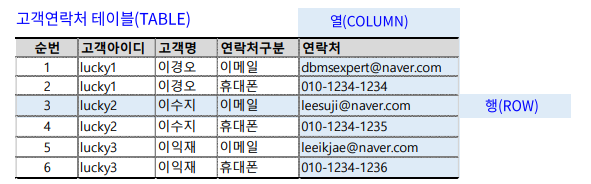 | 행(ROW) | 테이블의 가로축 텍스트 파일로 치면 한 개의 라인 |
