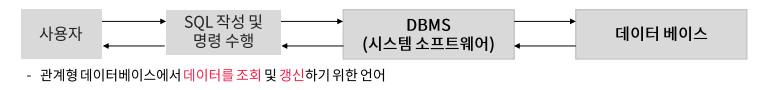 - 관계형 데이터베이스 관리 시스템에서 자료의 검색과 관리, 데이터베이스 스키마 생성과 수정, 데이터베이스 객체 접근 조정 관리를 위해 고안되었다.