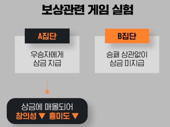 외재적 보상에만 과심을 쏟게 되면 보상에만 집중하게 돼 시야가 좁아진다는 실험 결과 였어요.