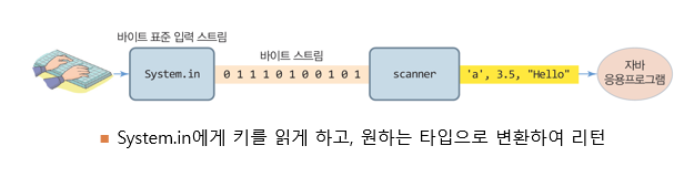 : System.in 에게 키를 읽게 하고, 읽은 바이트를 문자, 정수, 실수, 불린, 문자열 등 다양한 타입으로 변환하여 리턴 하는 명령어를 의미합니다.