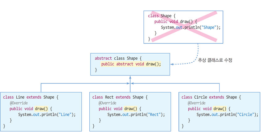 Line, Rect, Circle 은 추상클래스 Shape를 상속받아 만든 서브 클래스로서, draw()를 오버라이딩 하고 있는 것입니다.