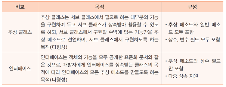 : 인터페이스는 스펙을 주어 클래스들이 그 기능을 서로 다르게 구현할 수 있도록 하는 클래스의 규격 선언이며,