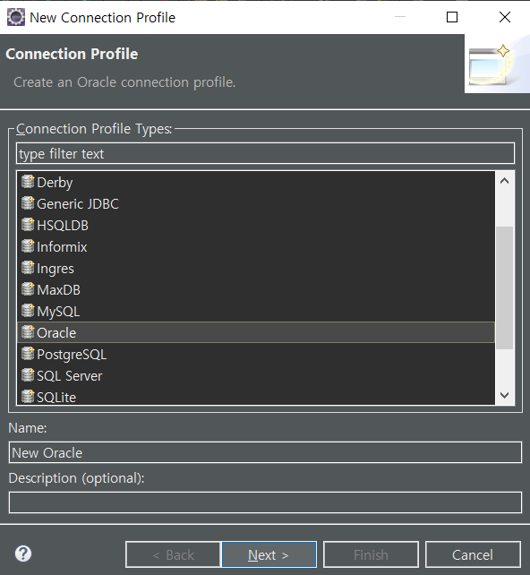여러가지 Database를 연결되어 있는데 사용하고 있는 것으로 선택하세요. 저는 오라클이 지원하는 Database 사용하기 때문에 오라클을 선택하고 Next >