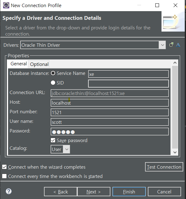 내 컴퓨터를 사용할 때는 localhost로 변경해주고, 사용할 아이디, 비밀번호를 입력하신후 service name 도 확인해주세요. 그리고 매번 비밀번호를 입력하는건 번거롭기 때문에 비밀번호는 저장하도록 하면 좋습니다.