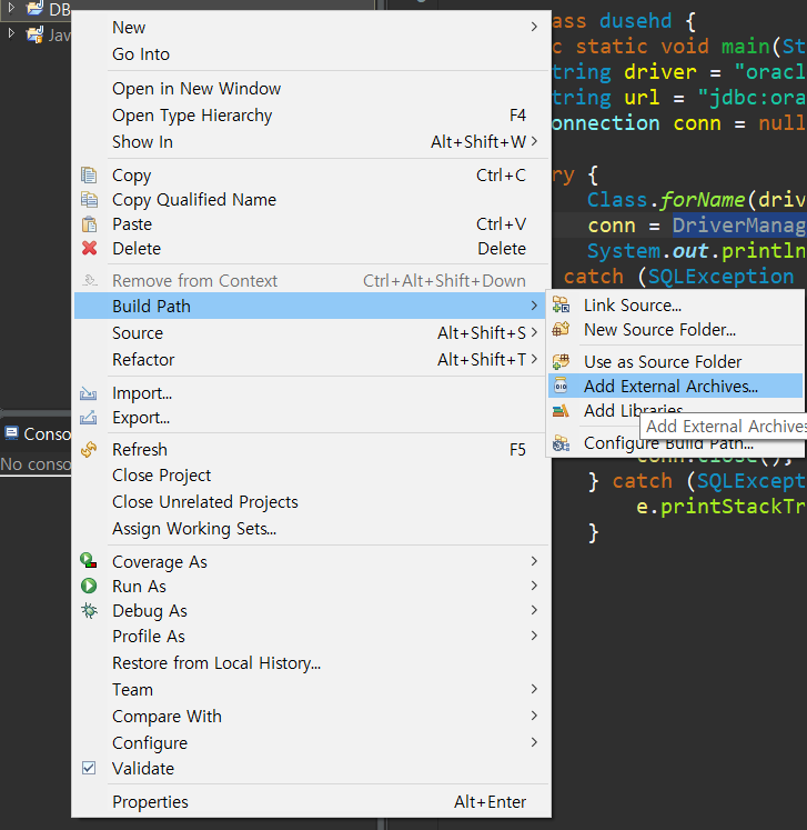 프로젝트에서 오른쪽 버튼 클릭하여 Built Path -> Add External Archives 선택합니다.
