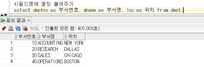 4)필드명에 별칭 붙여주기 (select 필드명1 as " 별칭 1" , 필드명2 as " 별칭2", 필드명3 as "별칭3"... from 테이블 이름;)