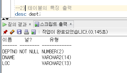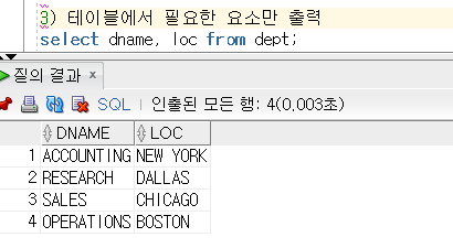 칼럼 : 결과 값같이 열의 위치에서 테이블의 필드명을 나타내주는 것입니다(dname, loc)