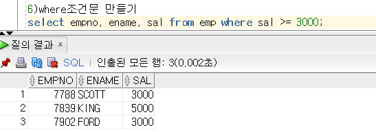 ex 1) 급여가 3000 이상인 사원 정보 출력 (급여 - sal/ 사원번호 - empno/ 사원이름 - ename)
