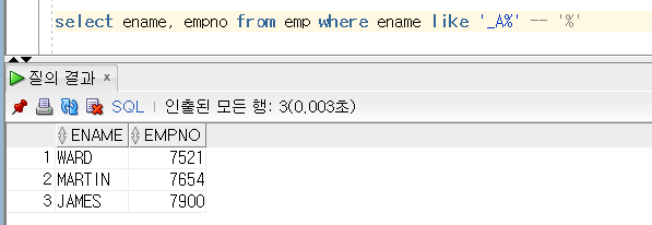 ex 3) 2번째 자리에 'A'가 들어가 있는 사원 출력