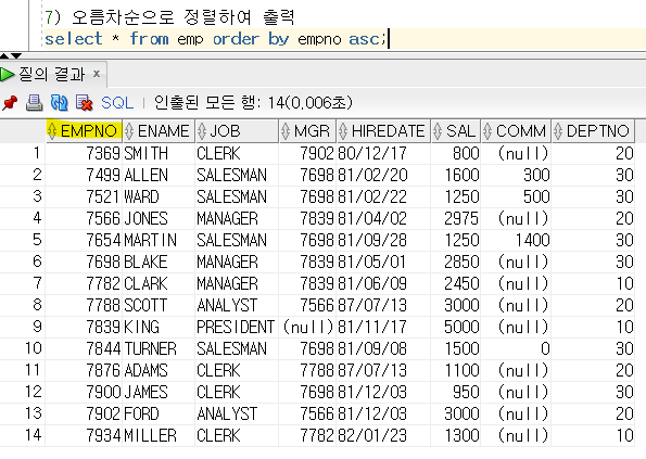 7) 오름차순으로 정렬하여 출력 (select * from 파일명 order by 필드명 asc;)