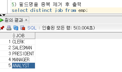 5) 필드명을 중복 제거 후 출력(select distinct 필드명 from 파일명;)