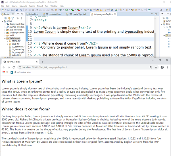 위의 형태와 같이 단락을 나눠주고 출력되게 하고 싶을 때 (<p>내용<p/>) 를 사용합니다.