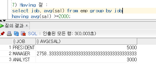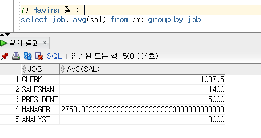 7) Having 절 : group by 절을 having 절을 통해서 추가적 조건을 가능하게 해줍니다