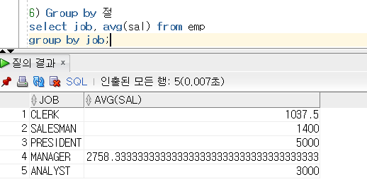 group by절을 통해서 결과 값이 5개의 그룹의 평균 급여로 정형화된 형식으로 출력 되었습니다.