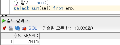 1) 합계 : sum() / 형식 : select sum(수치형 데이터가 들어있는 필드명) from 테이블명;