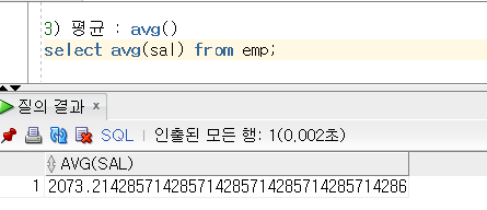 3) 평균 : avg() / 형식 : select avg(수치형 데이터가 들어있는 필드명) from 테이블명;