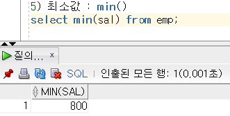 5) 최소값 : min() / 형식 : select min(수치형 데이터가 들어있는 필드명) from 테이블명;