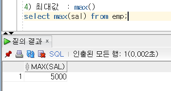 4) 최대값 : max() / 형식 : select max(수치형 데이터가 들어있는 필드명) from 테이블명;
