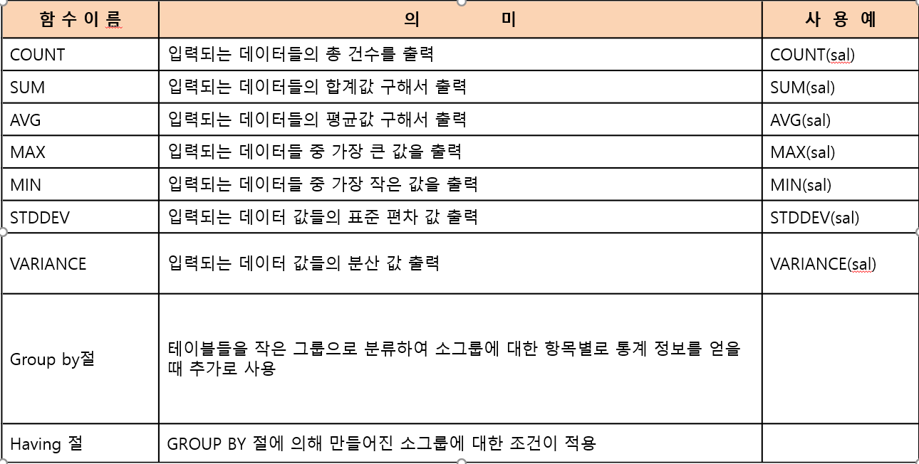 : 그룹 함수는 하나 이상의 테이블 값(행)을 그룹으로 묶어 연산을 통해서 합계, 평균 최대값 등 하나의 결과로 나타낼 수 있도록 도와주는 함수의 종류 입니다.
