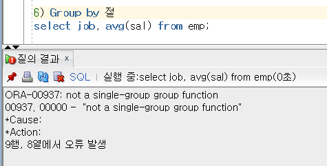 job이라는 테이블에는 14개의 값이 출력 되고, avg(sal)은 1개의 값이 출력 되기 때문입니다.