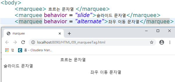 <marquee behavior = "slide">슬라이드 문자열 </marquee>
