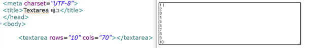 - 여러 줄의 글자를 입력할 때 사용하는 태그 (input 태그가 아닌 입력 양식 태그)