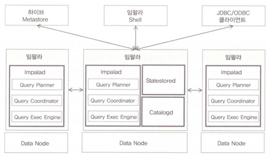 임팔라는 크게 impalad와 statestored 로 구성돼 있습니다. impalad는 분산 질의 엔진 역할을 담당하는 프로세스로, Hadoop 클러스터 내 데이터 노드 위에서 질의에 대한 plan 설계와 질의 처리 작업합니다. 그리고 impala state store 프로세스는 각 데이터 노드에서 수행되는 impalad에 대한 메타데이터를 유지하는 역할을 담당합니다. impalad 프로세스가 클러스터 내에 추가 또는 제거될 때, impala state store 프로세스를 통해 메타데이터가 업데이트됩니다.