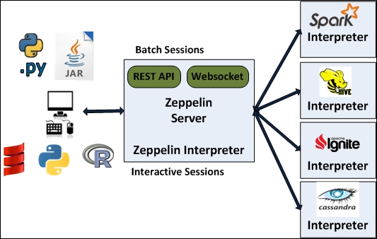 Zeppelin Server : NoteBook을 웹으로 제공하기 위한 웹 애플리케이션 서버로서 인터프리터 엔진 및 인터프리터 API 등을 지원