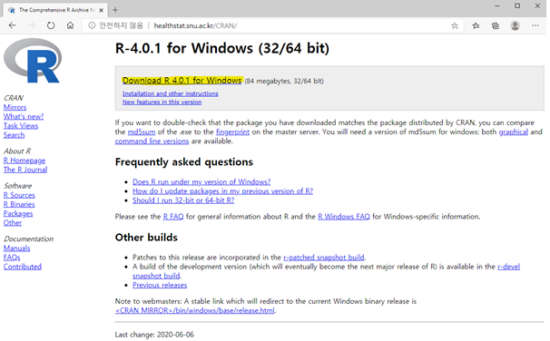 R 프로그램이 계속적으로 최신 버전이 나오고 있지만 호환성 때문에 무조건 최신 버전이 좋다고 하기는 좀 어려울 수 있습니다. 그래도 최신 버전을 다운 받아서 사용하겠습니다.
